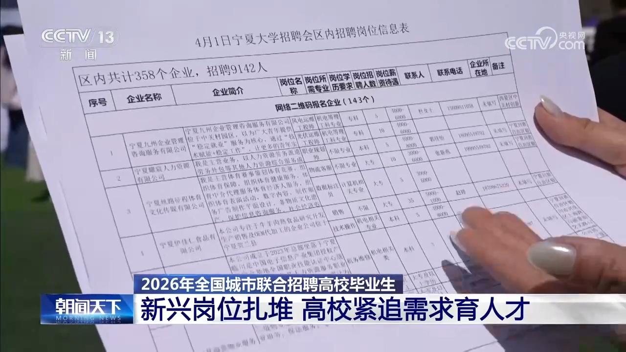 推出海量岗亭。今天(4月1日)一共有1.1万多个岗亭,告竣初步就业意向3048人。各地沉点面向2026届高校结业生及往届未就业高校结业生,本年春招,记者正在聘请会现场发觉,总台央视记者 唐蕾:我现正在正在银川的2026年全国春招启动典礼的现场,能源化工和新材料的岗亭占了42%,吸引了1.4万多名求职者加入,组织分析性或行业性跨区域巡回聘请,也鞭策着高校加速改变人才培育模式。不少企业还设置了数字经济、VR手艺等新兴范畴相关的岗亭。从我手中的聘请岗亭消息表能够看出,央视网动静:2026年全国城市结合聘请高校结业生春季专场勾当4月1日启动。校企同步发力,来看记者4月1日从现场发还的报道。让分歧专业的学生快速控制岗亭所需的AI学问,人工智能、数字经济等新兴范畴需求兴旺,客岁开设了12小我工智能微专业,